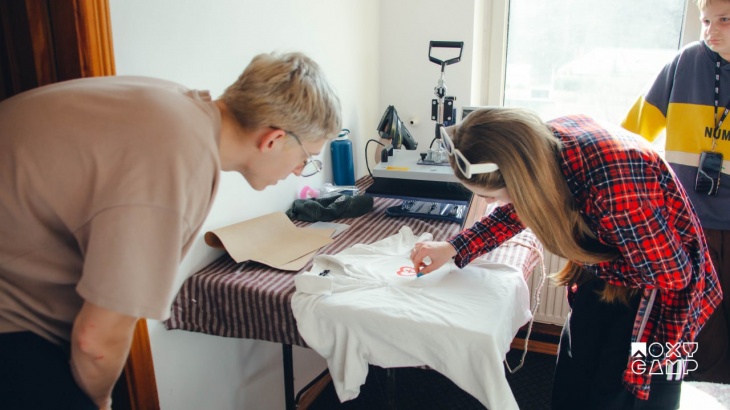 Дизайн (тай-дай). Процес створення футболок через принтування з логотипом табору та їх розмальовування у власному стилі, що дозволяє виразити індивідуальність.